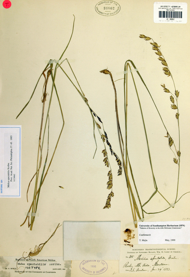 Melica spectabilis is a species of grass known by the common names purple oniongrass and showy oniongrass. It is native to western North America from British Columbia to northern California to the Rocky Mountains, where it grows in moist meadows, forests, and other mountainous habitat. It is native to western North America from British Columbia to northern California to the Rocky Mountains, where it grows in moist meadows, forests, and other mountainous habitat. Melica spectabilis is a perennial grass which varies in maximum height from under 10 centimetres (3. 9 in) to nearly a meter, growing from rhizomes and stalked, onionlike corms. The inflorescence is a narrow series of spikelets which are green with evenly spaced purple bands.