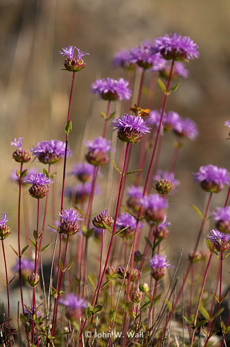 Monardella purpurea is a species of flowering plant in the mint family known by the common names Siskiyou monardella and serpentine monardella. It is native to the mountains of northern California and southern Oregon, including the Klamath Mountains, where it grows in chaparral and forest, often on serpentine soils. It is a perennial herb producing an erect, purple stem up to about 40 centimeters in maximum height. The oppositely arranged leaves are leathery, widely lance-shaped, and up to 3 centimeters long. The flower cluster is a head of several flowers blooming in a cup of leathery purplish leafs. The pinkish purple flowers are just over a centimeter long, narrow and tubular in shape with pointed lobes and protruding stamens.