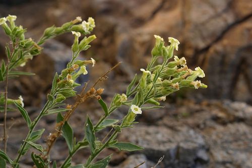 Nicotiana obtusifolia, or desert tobacco, is a plant native to the southwestern United States (from California to Utah to Texas) and Mexico. It is a woody perennial herb growing up to about 80 centimeters in maximum height. The leaves have blades up to 10 centimeters long, the lower ones borne on short petioles, the upper ones smaller and clasping the stem. The funnel-shaped flower is white or green-tinged, its tubular throat up to 2.6 centimeters long.