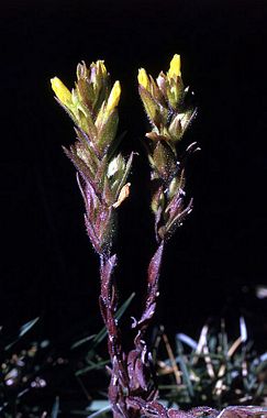 Orthocarpus luteus is a species of flowering plant in the broomrape family known by the common name yellow owl's clover. It is native to much of western and central North America, where it grows in many types of plateau, grassland, and mountain habitat. It is an annual herb producing a slender, hairy, hairy, bright yellowish green to deep purple stem up to about 40 centimeters tall. The narrow leaves are up to 5 centimeters long, the upper ones sometimes divided into three lobes. The flower cluster is a dense cylindrical spike of green leafs, the flowers emerging from between them. The lightly hairy flowers are 1 to 1.5 centimeters long and bright yellow in color. They are club-shaped, the upper lip a tiny, curving beak and the lower lip a narrow pouch.