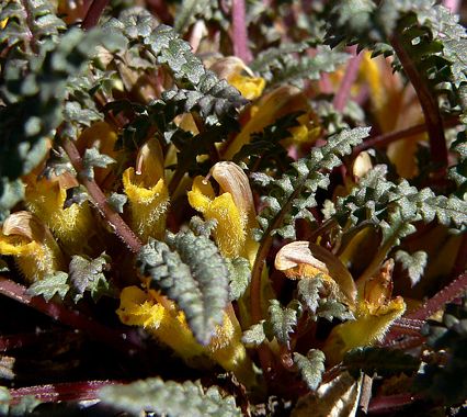 Pedicularis semibarbata is a species of flowering plant in the broomrape family known by the common name pinewoods lousewort. It is native to California and Nevada, where it can often be found in coniferous forests. This is a perennial herb producing several stems up to 20 centimeters long from a caudex, but most of the stem is beneath the soil and the plant is low on the ground. The leaves are up to 20 centimeters long, lance-shaped shape and divided into many toothed or lobed segments. The flower cluster is a raceme of flowers with hairy leafs and sepals surrounding the flower bases. Each hairy red- or purple-tinged yellow flower is club-shaped and may exceed 2 centimeters in length. Toward the middle it is divided into a broad hooded upper lip and a three-lobed lower lip. Like many species in the broomrape family, the lousewort is a root-parasite. This species taps nutrients from conifers and the lupine Lupinus fulcratus.