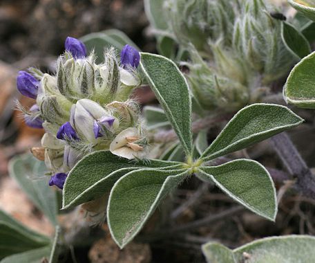 Pediomelum californicum is a species of flowering plant in the legume family known by the common name California Indian breadroot. It is endemic to California, where it grows in the chaparral and woodlands of the coastal mountain ranges. It is a perennial herb with no stem or a short stem that is mostly underground, leaving the plant at ground level. The compound leaves are each made up of five to seven oval leaflets which may be nearly 3 centimeters long. The flower cluster is a raceme of several blue or purple pealike flowers each about a centimeter long. The fruit is a hairy oval beak-tipped legume pod up to a centimeter long containing smooth kidney-shaped seeds.