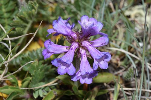 Penstemon procerus is a species of penstemon known by the common name littleflower penstemon. It is native to western North America from Alaska to California to Colorado, as far east in Canada as Manitoba, where it grows in mountain habitat such as meadows, often in alpine climates. It is a perennial herb forming mats of herbage with some erect stems reaching about 40 centimeters in maximum height. There are several varieties which vary in morphology, some more decumbent than others, several which are known commonly as pincushion penstemons for their matted forms. In general, the leaves are lance-shaped to oval, plentiful around the base of the plant with smaller ones arranged in opposite pairs along the stem. The flower cluster is made up of one or more clusters of tubular flowers with lipped, lobed mouths. Each flower is no more than one centimeter in length and is purple to blue in color, often with a white throat. The outside of the flower is generally hairless, while the inside may be lined with white or yellowish hairs.