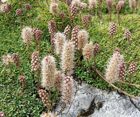 Petrophyton caespitosum (orth. var. Petrophytum caespitosum) is a species of flowering plant in the rose family known by the common name mat rock spiraea. It is native to the western United States where it grows in mountainous areas from the Sierra Nevada to the Rocky Mountains. It grows among rocks in forested and woodland habitat. This is a very low matted shrub growing in carpets up to 80 centimeters wide, creeping over rocks. The plant often grows on vertical surfaces and hangs by its roots, which cling to cracks in rock. The stems are thick and very short, covered densely in rosettes of oval leaves. It produces many flower clusters which are spikelike clusters of flowers arising on erect peduncles up to 10 centimeters tall. Each flower cluster is packed with flowers, each with five tiny white petals, many whiskery stamens, and usually 5 hairy pistils. The flower parts dry and may fall away, leaving a cluster of developing fruits, follicles containing the seeds.