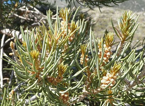 The Single-leaf Pinyon (Pinus monophylla) is a pine in the pinyon pine group, native to the United States and northwest Baja, Mexico. Within California it is found in the Sierras, the Transverse Range, and Peninsular Range. It occurs at moderate altitudes from 1200-2300 meter, rarely as low as 950 meter and as high as 2900 meter, in the most arid areas occupied by any pine in California. It is widespread and often abundant in this region, forming extensive open woodlands, often mixed with junipers. It is a small to medium size tree, reaching 10-20 meter tall and with a trunk diameter of up to 80 centimeter, rarely more. However, it is very slow growing, reaching only 3 ft. in seven years.The bark is irregularly furrowed and scaly. It is the world's only 1-needled pine; the leaves ('needles') are usually single (though trees with needles in pairs are found occasionally), stout, 4-6 centimeter long, and grey-green to strongly waxy pale blue-green, with stomata over the whole needle surface (and on both inner and outer surfaces of paired needles). The cones are acute-globose, the largest of the true pinyons, 4.5-8 centimeter long and broad when closed, green at first, ripening yellow-buff when 18-20 months old, with only a small number of very thick scales, typically 8-20 fertile scales. The cones open to 6-9 centimeter broad when mature, holding the seeds on the scales after opening. The seeds are 11-16 millimeter long, with a thin shell, a white endosperm, and a vestigial 1-2 millimeter wing; they are dispersed by the Pinyon Jay, which plucks the seeds out of the open cones. The jay, which uses the seeds as a food resource, stores many of the seeds for later use by burying them. Some of these stored seeds are not used and are able to grow into new trees. Indeed, Pinyon seeds will rarely germinate in the wild unless they are cached by jays or other animals. The seeds (pine nuts) are also harvested and eaten by people.