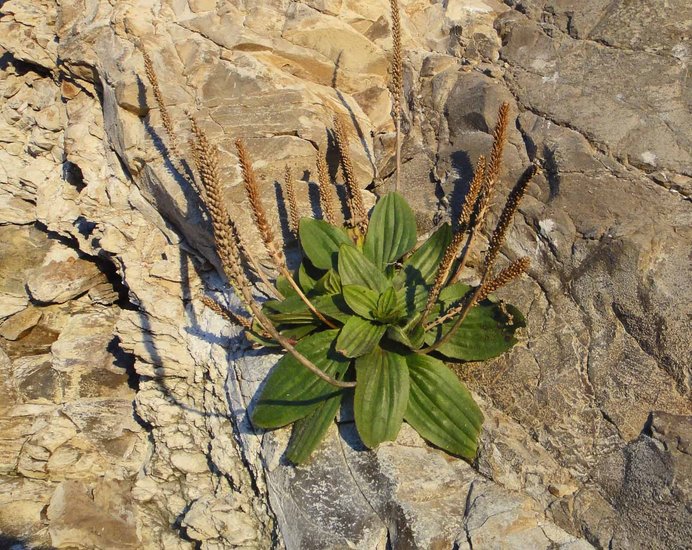 Plantago subnuda is a species of plantain known by the common name tall coastal plantain. It is native to western North America from the west coast of the United States to west-central Mexico, where it grows in wet and moist habitat types, often in coastal areas, such as marshland. It is a perennial herb producing few oval leaves around a thick caudex. The broad smooth-edged or slightly toothed leaves may be up to 40 centimeters long. The stemlike flower clusters grow erect to a maximum height near half a meter. Atop the peduncle of the flower cluster is a dense cylindrical spike of many tiny flowers. Each flower has a corolla of ephemeral petals about 3 millimeters long.