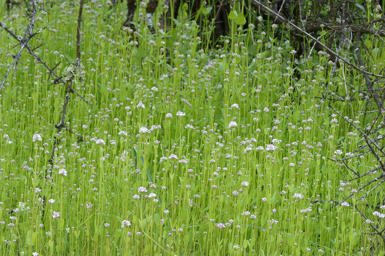 Plectritis congesta is a species of flowering plant in the honeysuckle family known by several common names, including shortspur seablush and rosy plectritis. It is native to western North America from Vancouver Island to southern California, where it is a common plant in coastal forests, seashores, mountain meadows, and other habitat. It is an annual herb growing erect 10 to 60 centimeters tall. The widely spaced, paired and oppositely arranged leaves are oval or somewhat oblong, smooth-edged, and up to 6 centimeters long by 2 wide. The upper ones lack petioles. The inflorescence is a dense headlike cluster of flowers in shades of bright pink to nearly white. Each flower has an upper and lower lobed lip under a centimeter in length and three protruding stamens tipped with purple anthers bearing yellow pollen.