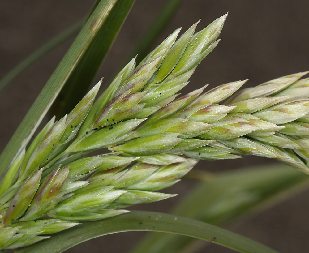 Poa macrantha is a species of grass known by the common names seashore bluegrass and large-flowered sand dune bluegrass. It is native to the west coast of North America from Alaska to northern California, where it grows in sand dunes and other beach habitat. Poa macrantha is a perennial grass growing in loose clumps with stems up to 60 centimeters in maximum height. The grass grows from a network of very long, stout rhizomes and stolons which may be up to 4 meters in length, anchoring the grass in its shifting sandy substrate. The inflorescence is a dense series of clustered spikelets which are flattened and longer than wide. The plant is dioecious with male and female individuals bearing different types of flowers; the two flower types are similar in appearance.
