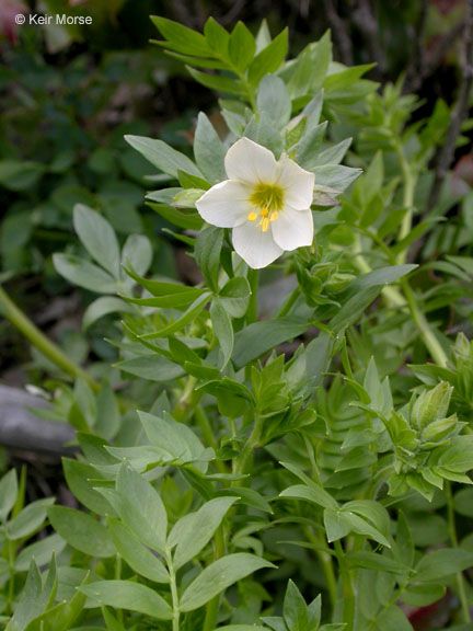 Polemonium carneum is a plant native to the northwestern United States west of the Cascade Range in Washington south to the San Francisco Bay Area in California. Common names include royal Jacob's ladder, great polemonium, and salmon polemonium. It grows in the lowlands and in prairies to moderate elevations in the mountains, and inhabits woody thickets, open and moist forests, prairie edges, and roadsides. This is a rhizomatous perennial herb producing one or more stems decumbent in form or erect to a maximum height near one meter. The leaves are compound with up to 21 leaflets each. The sticky-haired leaflets are somewhat lance-shaped and up to 4 centimeters long. The flower cluster is an open, spreading cluster of 3 to 7 flowers each borne on a thin peduncle. The flower is widely bell-shaped with a five-lobed corolla that may spread to nearly 3 centimeters wide. The flower corolla may be any shade of pale pink, salmon pink, yellow, or pale lavender to medium purple.