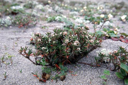 Polygonum paronychia is a species of flowering plant in the knotweed family known by the common names dune knotweed, black knotweed, and beach knotweed. It is native to the coastline of western North America from British Columbia to California, where it grows in sandy coastal habitat such as beaches, dunes, and scrub. Polygonum paronychia is a small prostrate or upright shrub producing multibranched brown stems up to a meter (40 inches) long. The stems may root at nodes that come in contact with moist substrate. The leaves are alternately arranged on the stems but are mostly located bunched around the tips of the stem branches. The leaves are linear to lance-shaped with rolled edges and bristly midribs on the undersides. Each leaf has a large stipule which forms a wide, membranous ochrea. The ochrea is up to 2 centimeters (0. 8 inches) long and is persistent, fraying into fibrous, silvery shreds that remain on the plant through the seasons. Flowers occur in the leaf axils. Each is up to a centimeter (0. 4 inches) wide with five narrow white or pinkish corolla lobes. Polygonum paronychia is a small prostrate or upright shrub producing multibranched brown stems up to a meter (40 inches) long. The stems may root at nodes that come in contact with moist substrate. The leaves are alternately arranged on the stems but are mostly located bunched around the tips of the stem branches. The leaves are linear to lance-shaped with rolled edges and bristly midribs on the undersides. Each leaf has a large stipule which forms a wide, membranous ochrea. The ochrea is up to 2 centimeters (0. 8 inches) long and is persistent, fraying into fibrous, silvery shreds that remain on the plant through the seasons. Flowers occur in the leaf axils. Each is up to a centimeter (0. 4 inches) wide with five narrow white or pinkish corolla lobes.