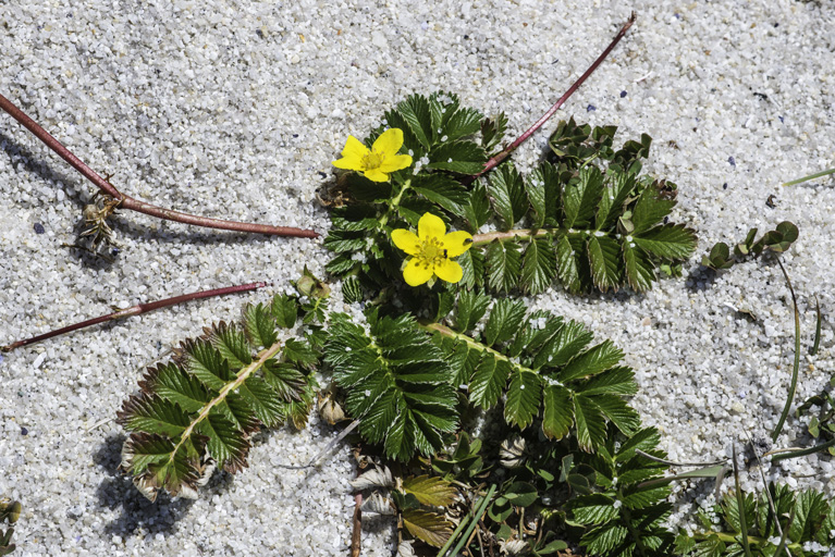Argentina anserina, also known as common silverweed, silverweed cinquefoil or just "silverweed", is a flowering perennial plant in the rose family Rosaceae. It is native throughout the temperate Northern Hemisphere, often on river shores and in grassy habitats such as meadows and road-sides. The plant was formerly classified in the genus Potentilla but was reclassified into the resurrected genus Argentina by research in the 1990s. It is a species aggregate which has frequently been divided into multiple species. Silverweed is most often found in sandy or gravelly soils, where it may spread rapidly by its prolific rooting stolons. It typically occurs in inland habitats, unlike A. egedii, which is a salt-tolerant coastal salt marsh plant.