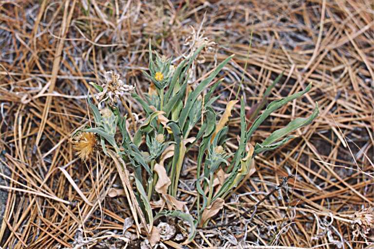 Pyrrocoma carthamoides is a species of flowering plant in the aster family known by the common name largeflower goldenweed. It is native to western North America from British Columbia to northeastern California to Wyoming, where it is known from grassland, woodlands, forests, barren areas, and other habitat. It is a perennial herb growing from a taproot and producing one or more stems to about half a meter in maximum length, the stems reddish-green and leafy. The largest leaves are at the base of the stem, measuring up to 20 centimeters long, lance-shaped with spiny sawtoothed edges. Leaves higher on the stem are smaller and hairier. The inflorescence is a single flower head or a cluster of up to four. Each bell-shaped head is lined with phyllaries each up to 2 centimeters long. It has many yellow disc florets surrounded by a fringe of yellow ray florets up to 7 millimeters long; ray florets are occasionally absent. The fruit is an achene which may be well over a centimeter in length including its pappus. There are three varieties of this species; var. subsquarrosa is an uncommon type known only from southwestern Montana and northwestern Wyoming.