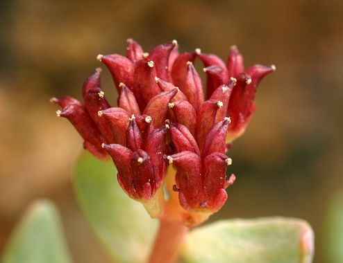 Rhodiola integrifolia is a species of flowering plant in the stonecrop family known by the common names ledge stonecrop, western roseroot, and king's crown. It is native to north-easternmost Russia, including Kamchatka, and western North America, where it grows in mountainous habitat in subalpine and alpine climates, including meadows, cliffs, and talus. It is a perennial herb producing a stout stem from a fleshy, branching caudex, reaching a maximum height near 30 centimeters. The fleshy leaves are alternately arranged on the stem, widely lance-shaped to oval and pointed, flat but upcurved toward the tip, reaching 2. 5 centimeters long. They are green when new and age to orange, rose, or red. The inflorescence is a dense cyme of up to 50 flowers with fleshy petals in shades of bright red to deep purple. There are several subspecies of this plant, with one, ssp. leedyi, very rare and limited to a few populations in Minnesota and upstate New York. This subspecies is considered a relict from times when its range was covered in glaciers; it survives on barren cliffs which are kept cold by air blowing through cracks from subterranean caves. It is treated as a federally listed threatened species in the United States.