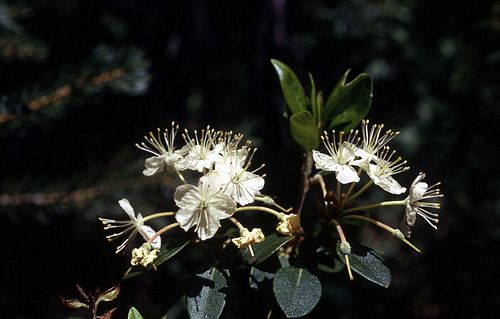 Rhododendron neoglandulosum (formerly Ledum glandulosum) is a species of rhododendron known by the common names western Labrador tea and trapper's tea. It is a common shrub of western North America from British Columbia to California to Colorado, where it grows in moist areas such as bogs and marshes. This is an erect evergreen shrub exceeding a meter in maximum height with hairless bark along the stem and hairy or nonhairy hairs on the newer twigs. The leathery leaves are oval-shaped and up to about 3.5 centimeters long. They are fuzzy and hairy on the undersides. The flower clusters appear at the ends of branches. They are racemes of small white to cream or yellowish flowers with five rounded petals and 8 to 10 protruding stamens. The fruit is a capsule containing winged seeds. A number of Native American peoples boiled the leaves of this shrub to make tea.