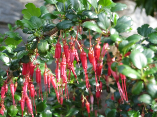 Fuchsia flowered gooseberry (Ribes speciosum) is a deciduous shrub in the Gooseberry family (Grossulariaceae). It has small, dark green, glossy leaves and thorns along the branches. The beautiful fuchsia-red flowers hang down in abundance from the branches throughout the bush. The tube-shaped flowers with their protruding stamens and stigmas look a little like red-dressed ballerinas dancing in a line.