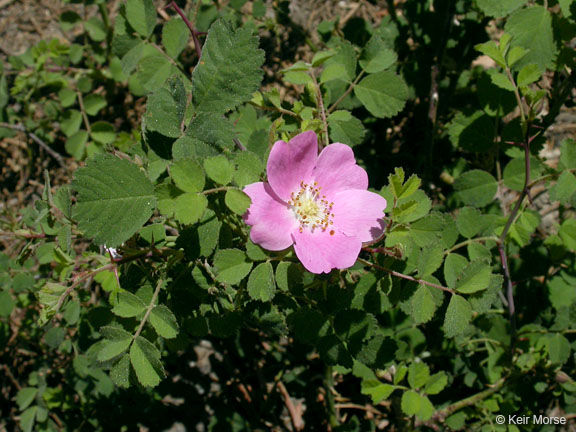 Rosa bridgesii is a species of rose known by the common names pygmy rose and Sierran dwarf rose. It is native to California, where it grows in the forests of the Sierra Nevada and surrounding mountains and foothills. It may also occur in Oregon. This rose is sometimes treated as a variety of Rosa gymnocarpa. Rosa bridgesii is a small rhizomatous shrub growing 10 to 80 centimeters tall. The brown stem is covered in paired prickles. The leaves are each made up of a few hairy, glandular leaflets which are oval in shape and toothed. The leaflet at the end of the leaf is up to 3 centimeters long and has a flat tip. The inflorescence is a solitary flower or cyme of up to 5 flowers. The flower has five glandular sepals and five pink petals each up to 1. 5 centimeters long. At the center are many stamens and up to 20 pistils. The fruit is a rose hip up to a centimeter wide.