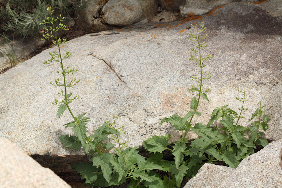 Scrophularia desertorum is a species of flowering plant in the figwort family known by the common name desert figwort. It is native to eastern California and Nevada, where it grows in dry areas in local mountain ranges, including the Sierra Nevada and the desert ranges adjacent. It is a perennial herb producing clusters of erect stems that often exceed one meter tall. The leaves have toothed, triangular or lance-shaped blades up to 13 centimeters long which are borne on petioles measuring up to 10 centimeters in length. The inflorescence is a wide-open panicle with several hairy, glandular branches bearing flowers. The flower has a spherical corolla opening at the top into a hoodlike, lobed mouth. The corolla is just under a centimeter long and is whitish at the base and deep red around the mouth and on the lobes. The staminode is generally visible in the mouth of the corolla. The fruit is a capsule just under a centimeter long containing many seeds.