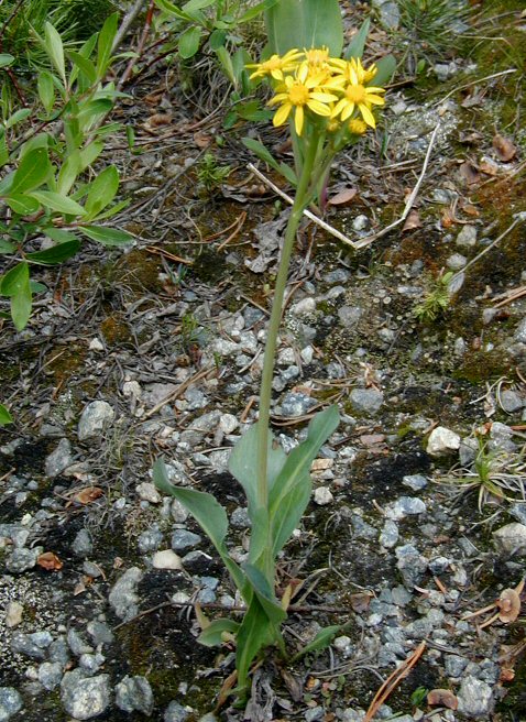 Senecio integerrimus is a species of flowering plant in the aster family known by the common names lambstongue ragwort and tall western groundsel. It is native to western and central North America, where it grows in grassland, forest, and other habitat. It is a biennial or perennial herb producing a single erect stem 20 to 70 centimeters tall from a caudex with a fleshy root. The linear to lance-shaped or triangular leaves have blades up to 25 centimeters long. The herbage is slightly hairy to woolly or cobwebby. The inflorescence bears several flower heads in a cluster, the middle, terminal head often largest and held on a shorter peduncle, making the cluster look flat. The heads contain many disc florets and usually 8 or 13 ray florets which may be yellow to cream to white in color. Some heads lack ray florets.