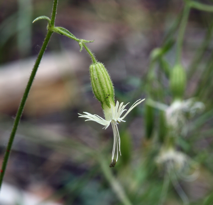 Silene lemmonii is a species of flowering plant in the pink family known by the common name Lemmon's catchfly. It is native to the mountains of Oregon and California, where it grows in many types of woodland and forest habitat, often in moist areas. Silene lemmonii is a perennial herb producing several stems and shoots from a woody, branching caudex. The decumbent or erect stems may be up to 45 centimeters long and are hairy, the hairs on the upper parts glandular. Most of the leaves are located low on the plant and are oval to lance-shaped, measuring a few centimeters in length; smaller leaves may occur on the upper stem. The inflorescence bears 1 to 7 nodding flowers on sticky glandular stalks. The moth-pollinated flower has a tubular or inflated calyx of fused sepals open at the tip to reveal five petals. The petals are whitish, yellowish, or pinkish, and their tips are deeply divided into four narrow, sometimes hairlike lobes that may curl and tangle. The long stamens protrude from the mouth of the flower, and the three whiskerlike styles protrude even farther.