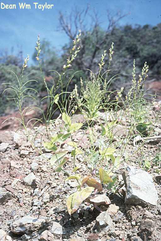 Streptanthus drepanoides is an uncommon species of flowering plant in the mustard family known by the common name sicklefruit jewelflower. It is endemic to California, where it is known from a scattered distribution throughout several mountain ranges in the northern part of the state, including the Klamath Mountains. It is a resident of chaparral and woodlands, generally on serpentine soils. It is an annual herb producing a mostly hairless, waxy stem up to 40 or 45 centimeters tall. The ephemeral basal leaves have round or oval blades, sometimes edged with teeth. Leaves higher on the stem have fleshy oval blades that clasp the stem, the lower ones each measuring up to 9 centimeters long by 7. 5 wide. Flowers occur at intervals along the upper stem. Each has an urn-shaped calyx of greenish or yellowish sepals under a centimeter long with whitish or purplish, purple-veined petals emerging from the tip. The fruit is a straight or sickle-shaped curving silique up to 9 centimeters long.