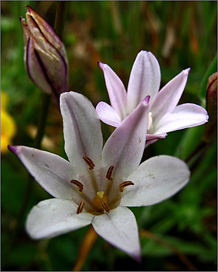 Triteleia peduncularis is a monocot flowering plant in the genus Triteleia. Its common names include long-ray brodiaea and longray triteleia. It is endemic to California, where it occurs in the coastal and inland mountain ranges of the northern and central sections of the state. It grows in vernally moist habitat such as meadows, grassland, and vernal pools, often in areas with serpentine soils. It is a perennial wildflower growing from a corm. There are two or three basal leaves measuring up to 40 cm (16 in) long and 1. 5 cm (0. 6 in) wide. The inflorescence arises on a smooth, erect stem up to 80 cm (31 in) tall. It is an umbel-like cluster of several flowers which are borne on very long, straight pedicels measuring up to 18 cm (7. 1 in) long. Each funnel-shaped flower is white, often tinged purple, with six tepals up to 1. 6 cm (0. 6 in) in length. There are six stamens with white anthers, and the ovary at the center is yellow when the flower is fresh.