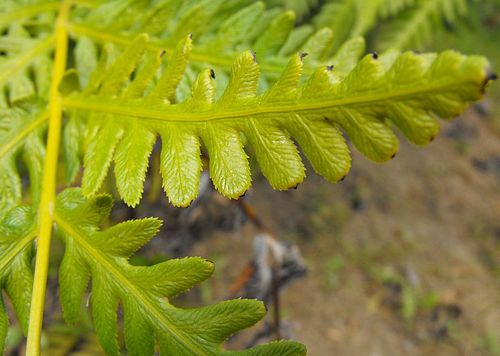 Giant Chain Fern (Woodwardia fimbriata) is the largest fern in North America, with upright, arching fronds that are wide and lacy. It can reach 3 to 5 feet tall. It will be either evergreen or summer deciduous, depending on its growing conditions.